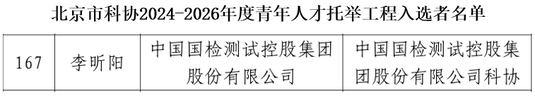 近日,北京市科协公布2024年北京市科协人才托举工程入选者名单,国检集团第一检验认证院李昕阳榜上有名。