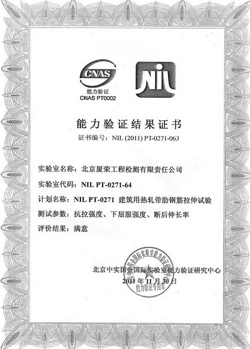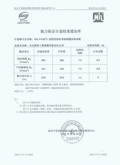 为加强对实验室的监督管理,提高检验技术水平,保证检测数据准确可靠,我中心参加了北京市质量技术监督局组织的2011年度“NIL PT-0271建筑用热轧带肋钢筋拉伸试验”能力验证活动。本次能力验证工作采取盲样测试的方式,由北京中实国金国际实验室能力验证中心提供验证样品,我中心进行复测,将复测结果上报到北京中实国金国际实验室能力验证研究中心,评定其检测结果的准确性。 本次能力验证结果满意,充分体现了我中心在钢筋检验项目上技术较好,发挥稳定,为圆满完成委托任务做好了技术支撑。 近年来,我中心一直积极参加国家、行业和实验室间组织的各种能力验证和比对试验,不断巩固和提高中心的检测技术水平和地位,竭诚为客户提供科学、准确的检测数据和优质、高效的检测服务。