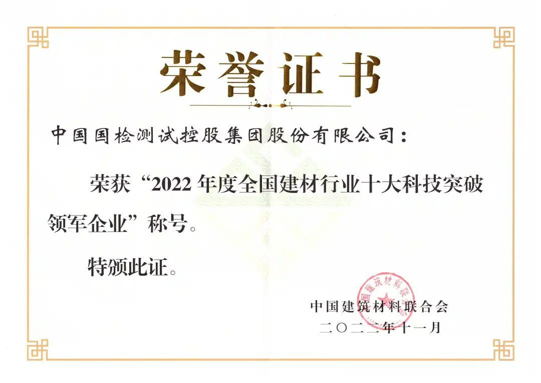 创新驱动发展,科技引领未来。加强产学研深度融合、强化目标导向、提高科技成果转化和产业化水平、发挥科技型人才引领支撑作用、创新链产业链资金链人才链糅合一体,国检集团一直坚持走在科技创新高质量发展的道路上,用滴水穿石的决心和毅力,换来聚沙成塔的创新突破。 11月17日,中国建筑材料联合会发布了全国建材行业2022年度“十大科技突破领军企业”榜单,国检集团凭借对科技创新的不懈努力与执着追求,喜获 “十大科技突破领军企业”荣誉称号。