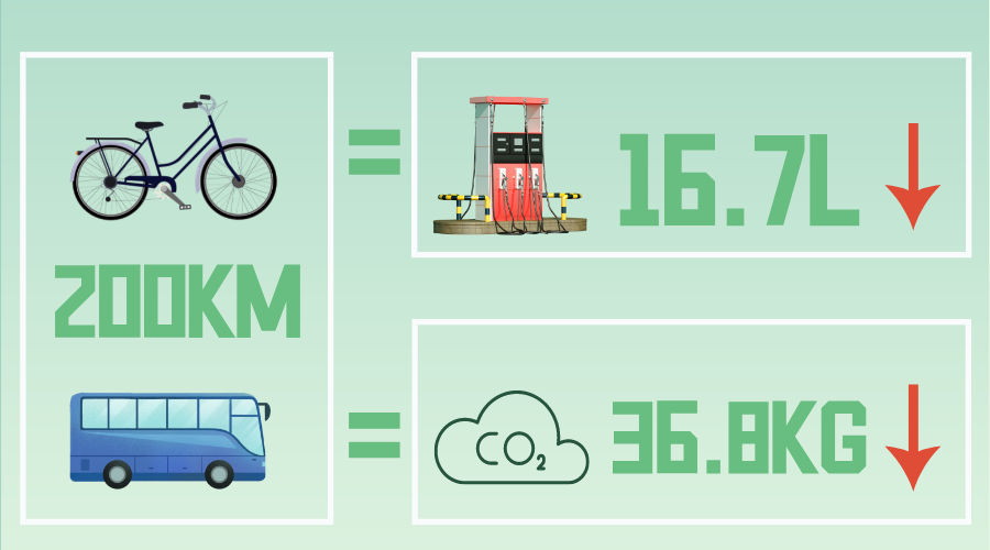 在大家的共同努力下,集团总部员工完成骑自行车或步行代替驾车出行100公里,节油约9升;坐公交车代替自驾车出行100公里省油六分之五。按以上方式节能出行200公里,每人可以减少汽油消耗16.7升,相应减排二氧化碳36.8千克。