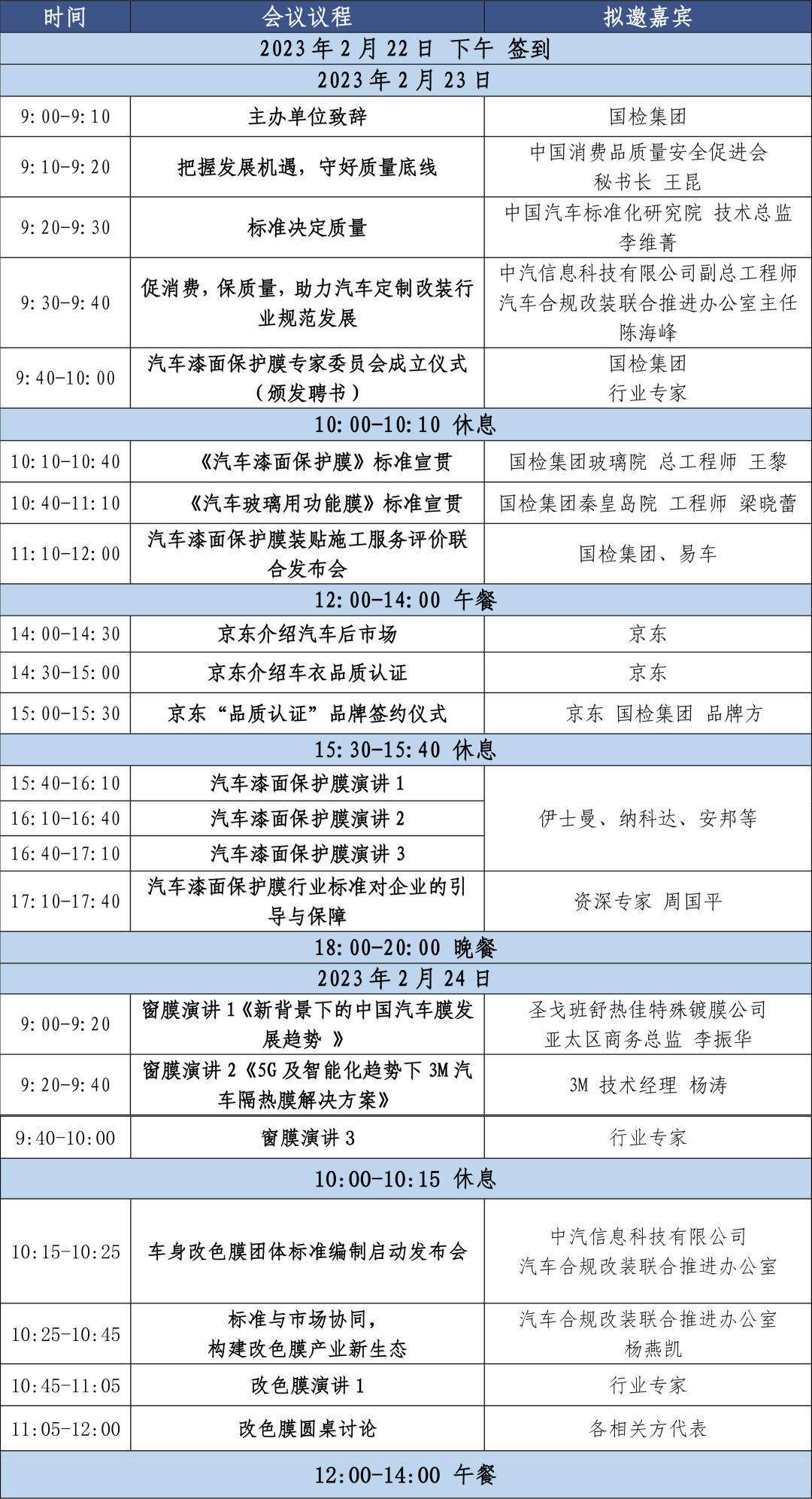 为推动汽车漆面保护膜、汽车玻璃用功能膜行业的高品质发展,国检集团将于2月23日至24日在上海举办“《汽车漆面保护膜》《汽车玻璃用功能膜》标准宣贯暨第一届汽车膜行业发展论坛”。 论坛以“质量·创新·发展”为主题,邀请领域内的专家学者、主机企业、生产商、流通商、平台商、品牌商、施工门店等行业代表,通过主旨演讲、圆桌对话等形式,围绕产品质量、技术创新和产业发展等核心问题进行开放式交流和探讨,以期引导、促进汽车膜行业的高品质发展。 02参会单位 主办单位 中国国检测试控股集团股份有限公司 国家安全玻璃及石英玻璃质量检验检测中心 国家玻璃质量检验检测中心 指导单位 中国消费品质量安全促进会 中国汽车标准化研究院 支持单位 中汽信息科技有限公司 汽车合规改装联合推进办公室 合作单位 伊士曼(中国)投资管理有限公司 南通纳科达聚氨酯科技有限公司 北京京东世纪贸易有限公司 浦诺菲新材料有限公司 (合作单位持续更新中…) 03会议日程