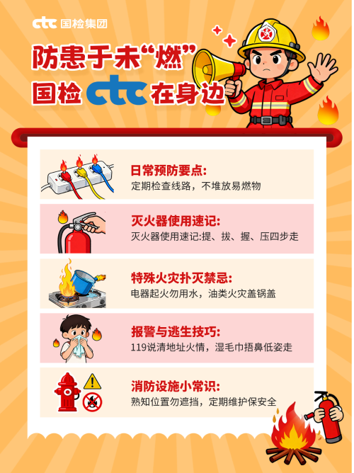 火灾无情 警钟长鸣 - 国检集团,防患于未“燃” - 火灾无情,警钟长鸣。一根未熄灭的烟头、一条老化的电线、一次充电中的手机……都可能成为危险的火源。据统计,多数火灾都源于日常疏忽。我们不仅要增强防火意识,更要将安全习惯落到实处。 日常防火:从这些细节做起 # 厨房用火 油锅起火切勿用水灭火,这会让火势瞬间扩大。正确做法是立即盖上锅盖,切断氧气供应,或者倒入大量蔬菜冷却降温定期用肥皂水检查燃气软管接口,发现气泡立即报修。安装燃气报警器,它能在泄漏第一时间发出警报。 # 电器安全 插座使用避免"一插多用电"的超负荷现象。大功率电器如空调、热水器要使用独立插座。手机、电动车电池充电时间不宜过长,充满后及时拔掉电源。切勿在沙发、床上充电,这极易引发火灾。 # 环境安全 易燃物品管理:打火机、花露水、空气清新剂等要远离热源。阳台、楼道不堆放纸箱、旧家具等杂物。 专业检测:让隐患无处可藏 防火不仅靠自觉 更需要科学防范 想知道建筑材料是否符合阻燃标准? 产品的燃烧性能等级? 国检集团检测能力覆盖国家标准(GB)、国际标准(ISO/EN/ASTM等),配备大型耐火试验炉、建材燃烧性能测试系统、构件耐火完整性测试装置等先进设备,业务范围辐射全国。服务范围包括保温材料、墙体材料、装饰装修材料、防火材料、耐火构件、屋面材料、铺地材料、纺织品材料、卫浴产品、安全防护材料等多种产品的检测,并为相关检验检测仪器设备提供专业的计量校准服务。 我们以国家级检测机构的技术实力、精准靠谱的检测服务,助您真正实现防患于未“燃”。 国检集团为您服务 火灾预防,人人有责 从细节做起,让安全成为一种习惯 专业的事,交给专业的人 国检集团,守护您的安全每一天 |