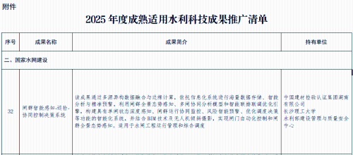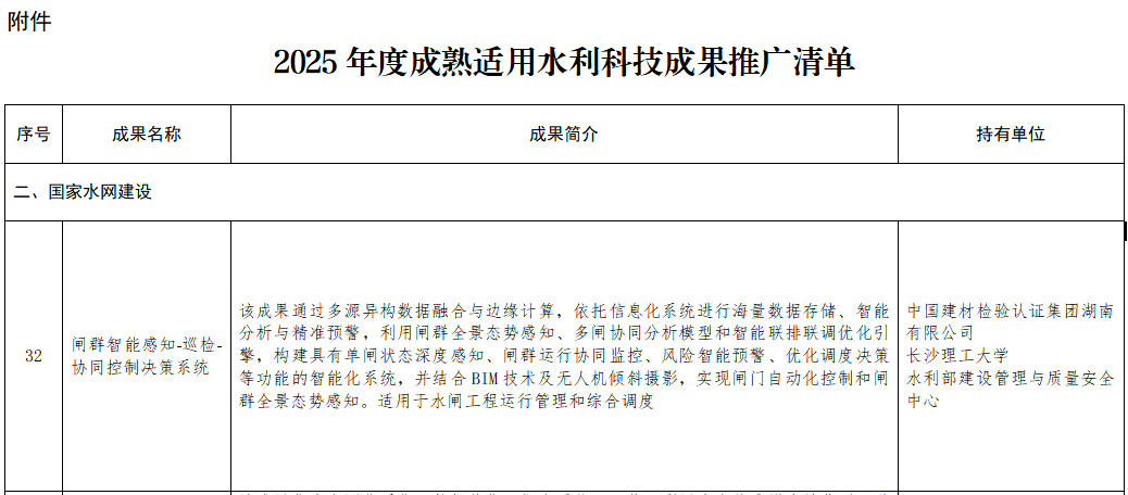 智慧水利 国检集团助推行业发展 近日,国检集团水利板块接连传来喜讯,不仅荣膺智慧水利 AAA 级企业认证,集齐水利三大领域 AAA 信用等级,牵头研发的智能系统还成功入选水利部科技成果推广清单,彰显了国检集团在智慧水利领域的硬核实力。 三项 AAA 认证加身,铸就行业信用标杆 中国水利企业协会最新发布的《2025 年节水企业、智慧水利企业信用评价结果》中,国检集团湖南公司凭借深厚的技术积累与突出的信用表现,获评“智慧水利 AAA 级企业”。此前,公司已先后获得中国水利工程协会“水利信用质量检测类 AAA 级机构” 和 “水利信用信息化类 AAA 级机构” 认证,标志着国检集团在水利技术服务行业的领先地位。 国检集团湖南公司自 2011 年成立以来,已建成超万平方米现代化办公实验场所,配置千余台先进仪器设备和专业人才,以智慧水利为核心战略,构建了覆盖 “感知、互联、分析、应用、服务” 的完整解决方案体系,技术成果已广泛应用于水库监测、智慧灌区、城市内涝、数字孪生、智慧农业、低空巡检等多个领域。 核心技术入选国家级清单,赋能水利现代化 水利部国际合作与科技司发布《2025 年度成熟适用水利科技成果推广清单》,由国检集团湖南公司牵头,联合长沙理工大学、水利部建设管理与质量安全中心共同研发的 “闸群智能感知 - 巡检 - 协同控制决策系统” 成功入选。 系统集成,智能管控 该系统以“天空地水工”一体化智能感知网络为基础,通过多源数据融合与边缘计算实现高效采集与分析,并依托信息化平台进行精准预警与决策支持。其核心创新包括: 1.数字孪生技术: 融合BIM、GIS与无人机倾斜摄影,构建三维数字孪生水闸,结合智能联排联调引擎,为防洪、灌溉等场景提供数字化决策支持; 2.人机交互技术:设计直观可视化界面,支持触控操作与实时状态显示,大幅提升操作便捷性与监控效率; 3.联机控制技术:基于水位信号或调度指令,实现闸门、水泵的自动化控制,支持多级阈值设定与实时监控; 4.闸群协同控制技术:通过全域感知网络与水动力模型,结合多目标优化算法,构建分级控制架构,实现防洪、供水、生态等多目标分钟级协同响应。 自 2024 年 10 月投入应用以来,该系统已在鼎城区中型水闸拆除重建项目、苏仙区山河水库灌区工程等项目中落地见效,其中苏仙区项目还入选《湖南省 “数字新基建” 100 个标志性项目名单(2025 年)》,成为技术转化的典范。 连续获得三项AAA级信用评价,是对国检集团湖南公司在技术能力、经营管理、市场信誉及社会责任等方面综合实力的最高褒奖。而核心技术成果入选部委推广清单,则是对公司创新研发与实践应用能力的充分肯定。国检集团湖南公司将持续聚焦智慧水利前沿技术,以更先进的技术、更完善的服务,积极助推新时代水利现代化建设与行业高质量发展,为国家水安全战略贡献坚实力量。 |
