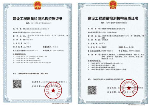 近日,国检集团上海公司既取得住建部颁发的全部九项检测专项资质后,又顺利取得建设工程质量检测综合资质,成为上海公司在建设工程质量检测领域又一重要突破。