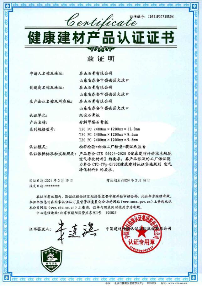 近日,国检集团为泰山石膏有限公司的分解甲醛石膏板产品颁发了石膏板领域首张空气净化类健康建材认证证书。