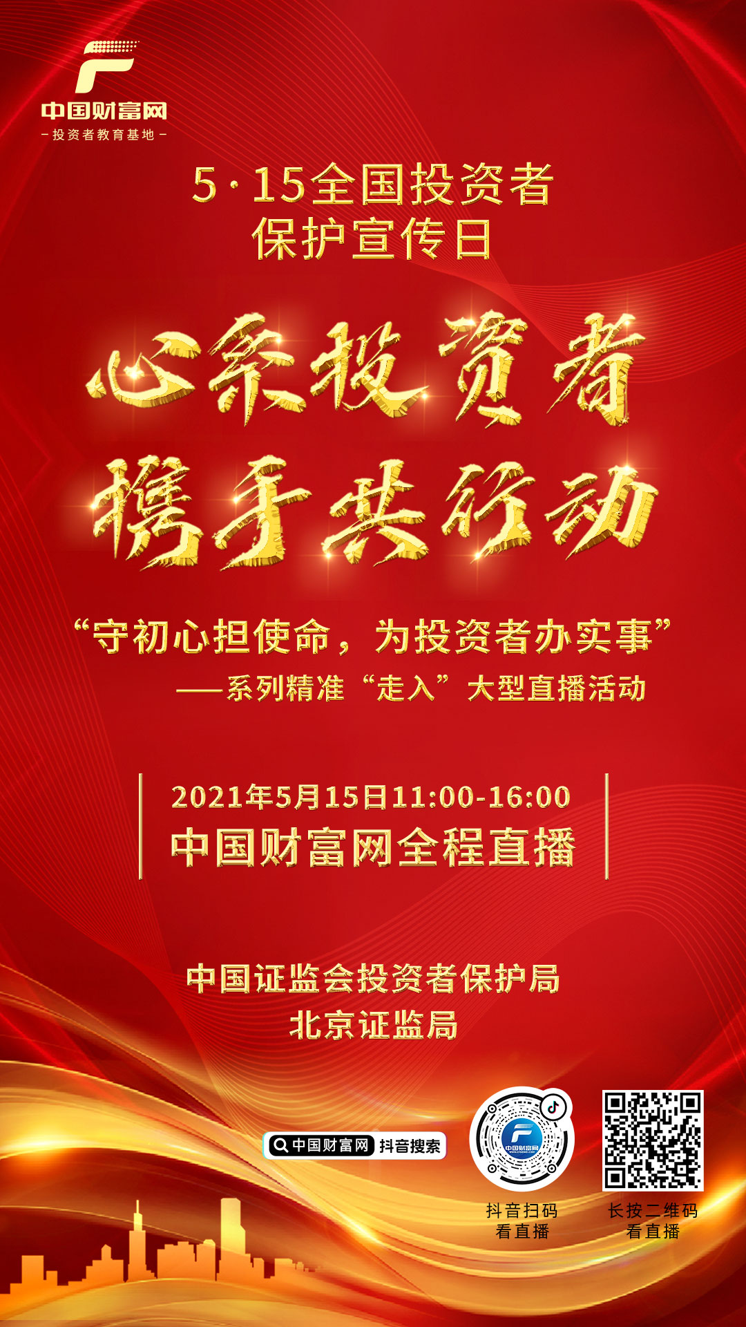 5月15日 股民再次迎来一年一度的专属“节日” “5·15 全国投资者保护宣传日” 这已经是第3个“全国投资者保护宣传日” 2019年5月15日 证监会确定了首个“全国投资者保护宣传日” 面对上市公司不断翻新的造假、退市、“割韭菜”等行为 股民们终于拥有了强有力的“保护伞” 这一天 “5·15投资者保护天团”已集结完毕 “一呼百应”接力为投资者保护发声 其中 中国证监会投资者保护局领取“军令状” 北京证监局全面吹响投资者保护集结号 携手辖区内的中国财富网投教基地 北京基金小镇投教基地、银河证券投教基地、东兴证券投教基地 等多家机构 为投资者献上权益保护的饕餮盛宴 本次活动 包含“八个系列精准走入”直播 不仅带你走入北京证监局 深入14个业务工作处室 还带你走入基层党建、走入社区 走入小学、扶贫县中学和大学…… 让你足不出户 便可获得“一站式”投资者权益贴心服务 本次系列直播活动中 还为您准备了精彩有趣的情景剧 北京证监局青年才俊为你倾情解读 以案为警,提升投资者投保意识 将资本市场的正能量传递到你手心 让你身边的投保工作 看得见、摸得着 敬请关注 5月15日11:00 “心系投资者,携手共行动 ——守初心担使命,为投资者办实事” 5·15投资者保护宣传日 系列精准“走入”大型直播活动 本次活动由中国证监会投资者保护局指导 北京证监局主办 中国财富网国家级投教基地特约支持 为你带来 “看得见的高效”和“感受得到的保护” 中国财富网抖音直播间、中国财富客户端 不见不散! |