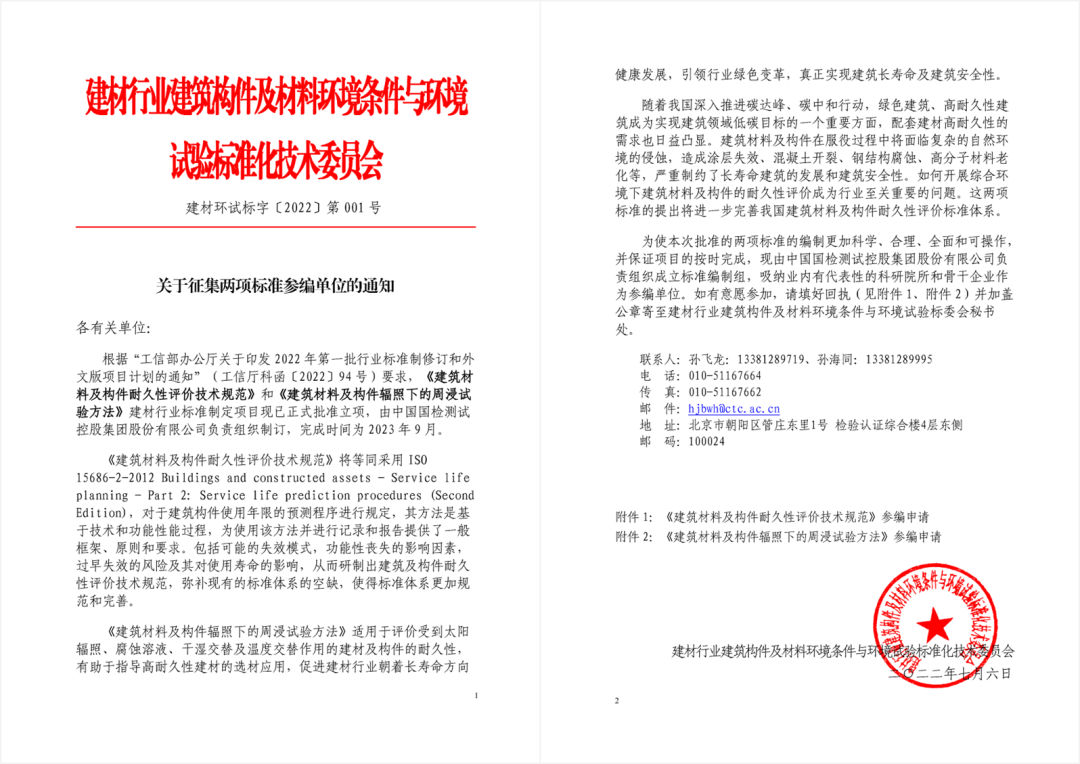 根据工信厅科函〔2022〕94号文“工信部办公厅关于印发2022年第一批行业标准制修订和外文版项目计划的通知”,由国检集团作为第一起草单位负责编制的标准2022-0263T-JC《建筑材料及构件耐久性评价技术规范》和2022-0478T-JC《建筑材料及构件辐照下的周浸试验方法》成功立项。