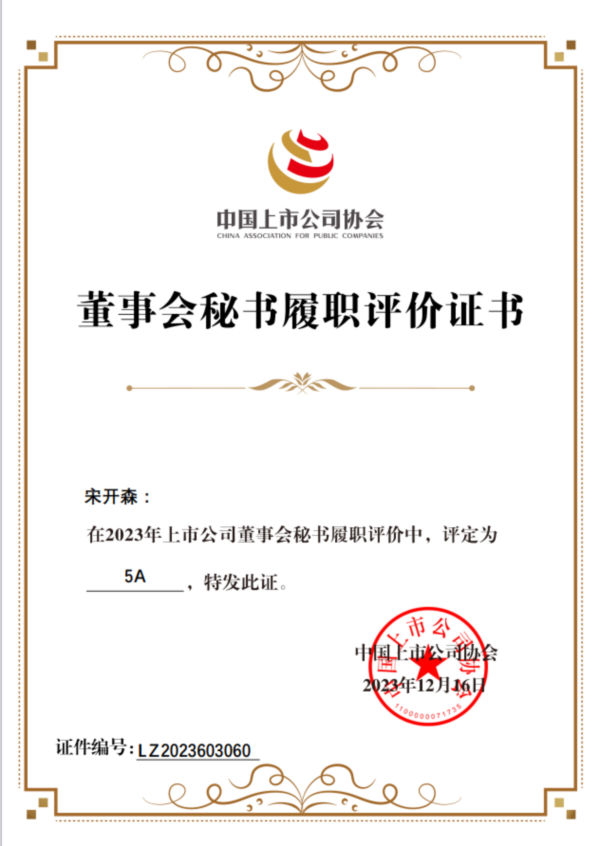 “上市公司董事会秘书履职评价”指标涵盖了董秘履职所涉及的上市公司规范运作、信息披露、内部控制、投资者关系管理等10大标准,55项指标。指标体系设定科学、客观、完备,国检集团董事会秘书宋开森在规范履职、合规运作、对外积极传递企业价值,多渠道维护好投资者关系等方面得到监管机构的高度认可,连续两年荣获5A评级。
